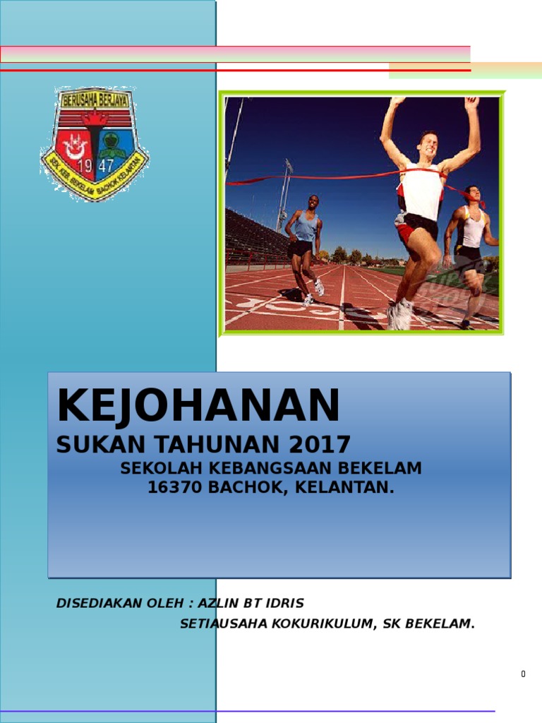 Buku Program Kejohanan Olahraga. Baru-baru ini sekolah saya baru sahaja selesai menjalankan Kejohanan Balapan dan Padang kali ke- 26 dan alhamdulilah segalanya berjalan lancar dan berjayaPelaksanaannya kali ini sedikit berlainan berbanding penganjuran pada tahun lepas dengan pertambahan jumlah acara dan hadiah yang disediakanDi sini saya sertakan senarai anugerah sukan yang cikgu-cikgu boleh adakah sewaktu Acara Kejohanan. 6 7 Februari 2013 Tempat.