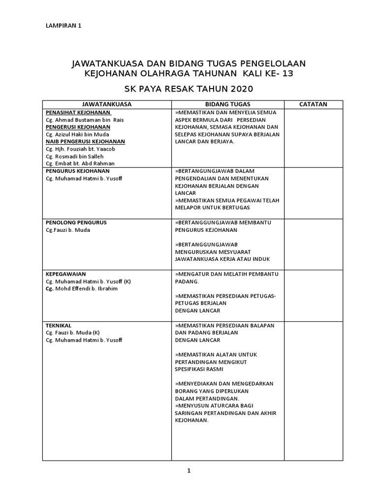 Memastikan Buku Program siap 6. Mortem selepas kejohanan Tanda jika Bi Bidang Tugas Tarikh telah Catatan l JawatankuasaPeranan dilaksanakan 3.